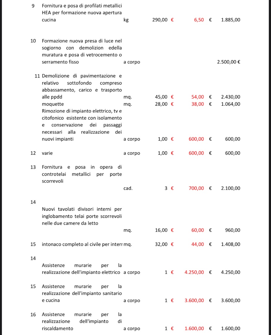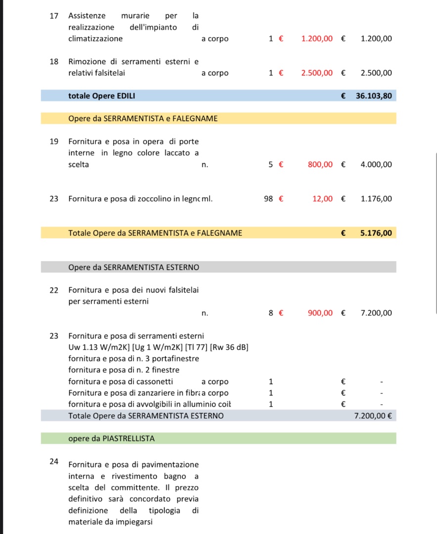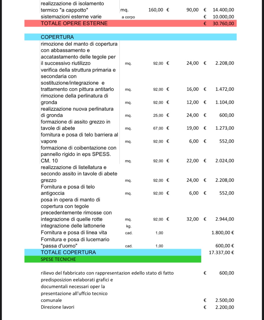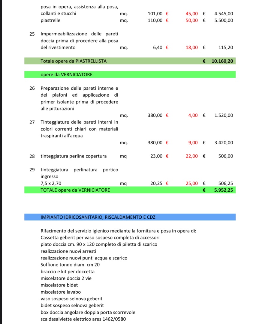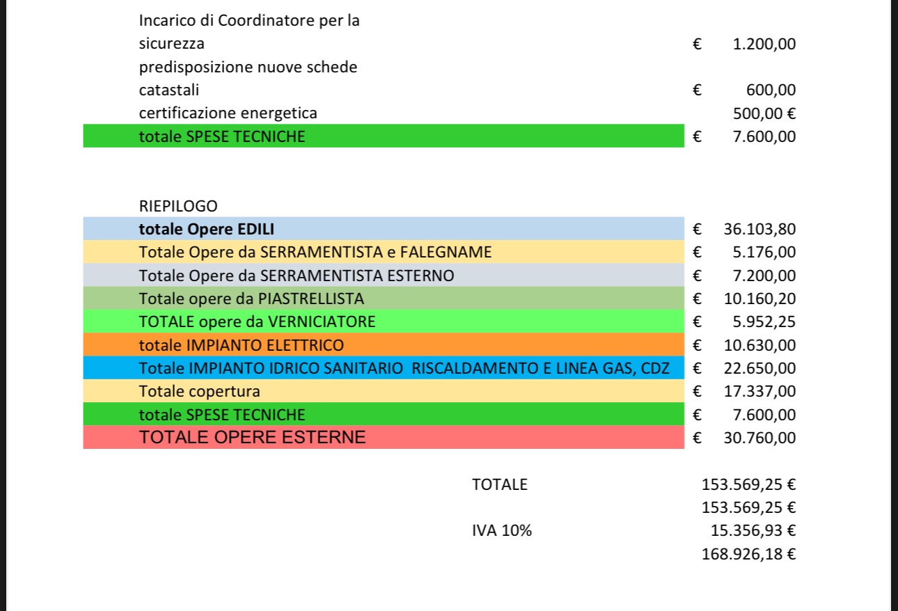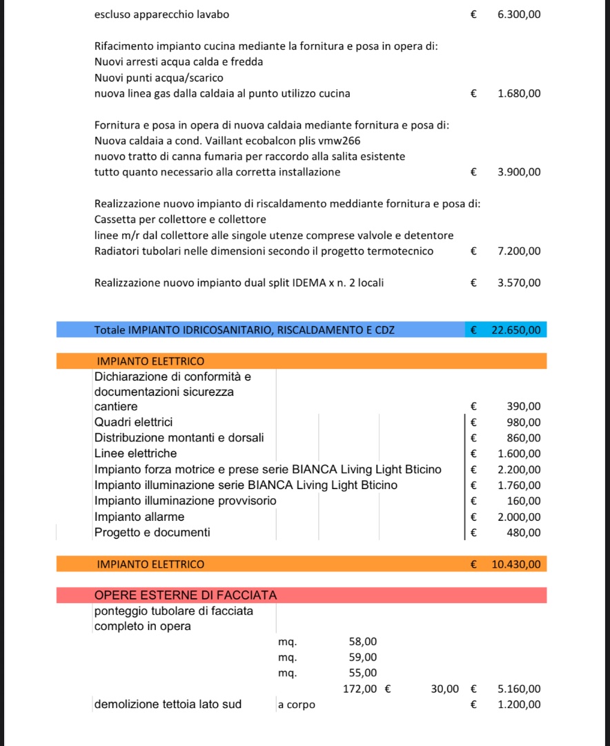 Ciao, mi rivolgo a voi per un parere, perchè è la prima volta che affronto una ristrutturazione. Vi spiego, ho ricevuto un preventivo di ristrutturazione completa impianti, tetto, facciata, serramenti per un totale di 170.000€ circa. Si tratta di prima casa, trilocale di 98mq, degli Anni 70. Casa semi indipendente. Secondo voi il costo è corretto o esagerato? Allego capitolato. Vi ringrazio in anticipo per i vostri preziosi pareri
